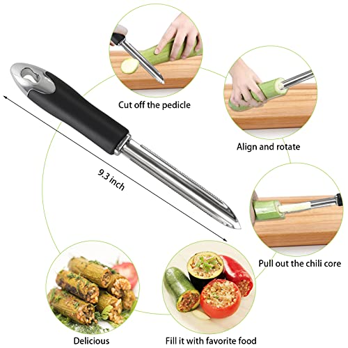 🌮 【Jalapeno Pepper Corer】:2pcs Jalapeno pepper corer seed remover was designed with serrated and spiral blade, pepper corer tool can remove seeds easily and get a complete shell of pepper, zucchini. And just fill them with sausages, minced meat, or cheese. Vegetable corer tool pepper corer – Boon for pepper lovers.