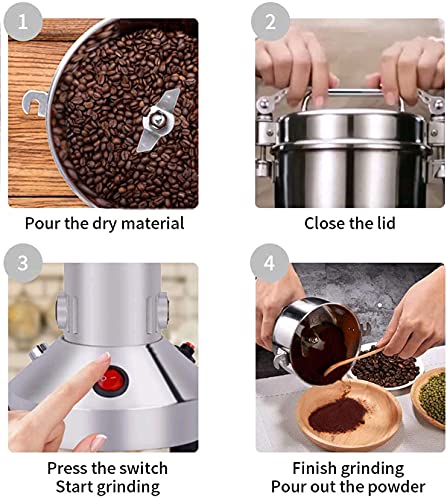 🌾SMIALL GRAIN GRINDER : Power:900W ; Capacity:150g; Interval Time:5-10 min;Rotating Speed: 22000R/Min,Triples blade: grinding blade, rotary blade, and powder removal blade, can be pulverized easily. Crushing fineness reaches from 50 to 300 mesh no more than a minute.metal motor blade: wear resistance good .Dry raw materials only.wet, moisture or oil materials can’t be ground
