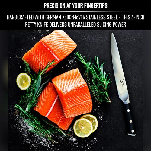 ✅ PREMIUM GERMAN STEEL BLADE, LEATHER SHEATH: Made with German ThyssenKrupp X50CrMoV15 Stainless Steel with a Rockwell Hardness of 56±2 HRC, this 6-inch petty knife offers great slicing power and durability. Its sturdy, but lightweight full blade design means greater efficiency and minimal hand and wrist fatigue during long food prepping sessions. The black leather sheath offers superior blade protection and safety when your go-to Chef knife is not in use.