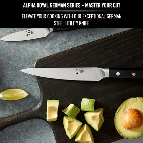 ✅ SETTING THE NEW STANDARD FOR GERMAN STEEL UTILITY KNIVES: Based on our highly successful Alpha-Royal Japanese Series design, this premium Stainless Steel version is sleek, sharp, durable, and is sure to outperform others in its class. This professional Utility knife has the best of both worlds at an affordable price – a sharp, tough, rust and stain resistant blade coupled with an ergonomically shaped and beautifully balanced full tang, triple riveted Pakkawood handle.