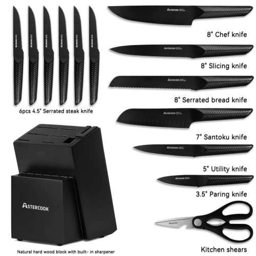 Astercook Knife Set, 15 Pieces Chef Kitchen Knife Set with Block, Built-in Knife Sharpener, German Stainless Steel Handle One-Piece Design Knife Block Set, Dishwasher Safe, Elegant Black