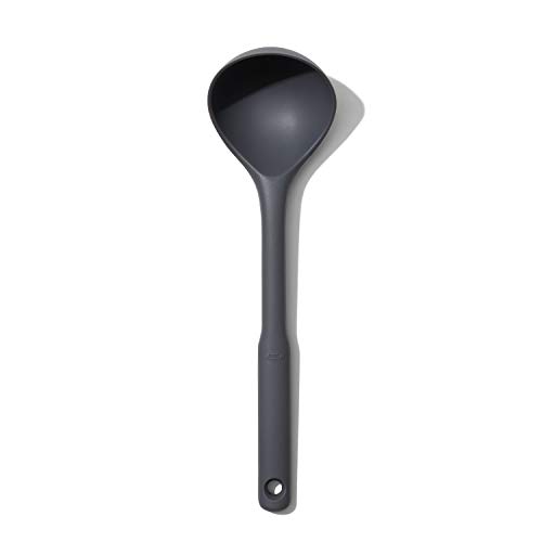 With the OXO Good Grips Silicone Everyday Ladle, it’s never a struggle to get every last spoonful out of the saucepan and onto your plate. The flexible front and sides bend to conform to the curve of any stockpot, so you can easily dish out your delicious cooking to enjoy now or store for later. This compact ladle has squared, slosh-proof edges for clean, drip-free serving. The unique angled design and sturdy scoop keep liquid where it belongs. The soft, non-slip grip is comfortable in your hand, no matter how many helpings you serve. Heat-safe silicone is gentle on non-stick cookware and is dishwasher safe, so cleanup is a breeze.