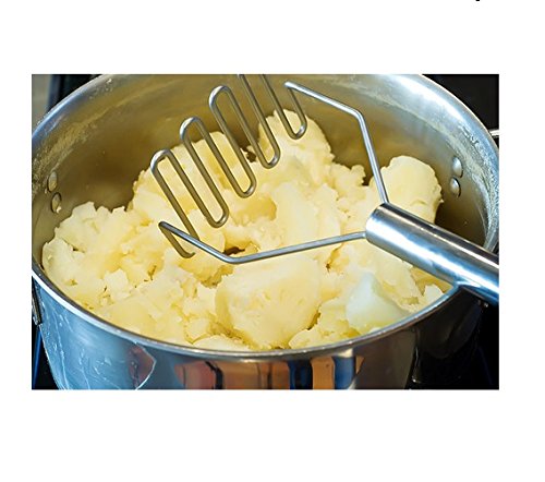 The classic potato masher is still around because it works. The Kuhn Rikon potato masher features a thick zigzag of stainless steel wire to crush potatoes efficiently. Heavy barrel handle is sealed and waterproof with a loop for hanging.